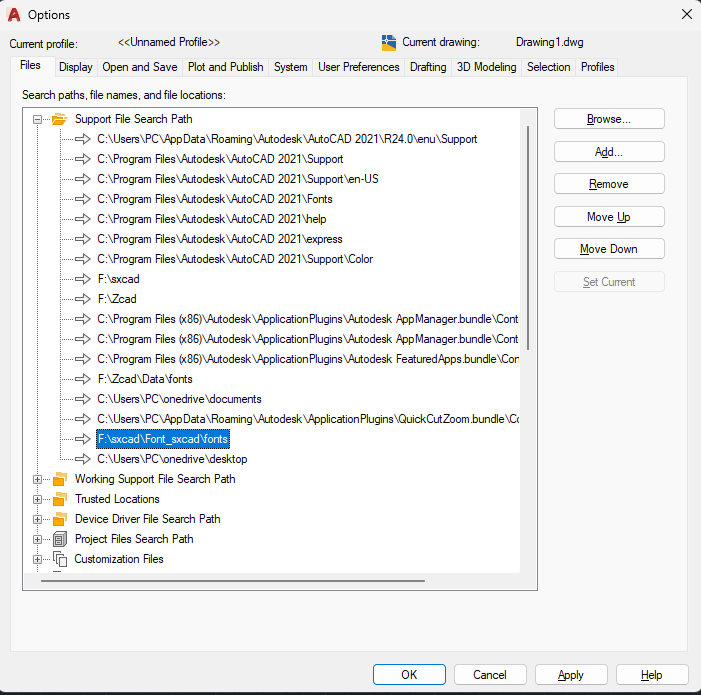 - Ngoài các thư mục mặc định, CAD còn tìm font trong những đường dẫn đã khai báo tại: Options → Files → Support File Search Path